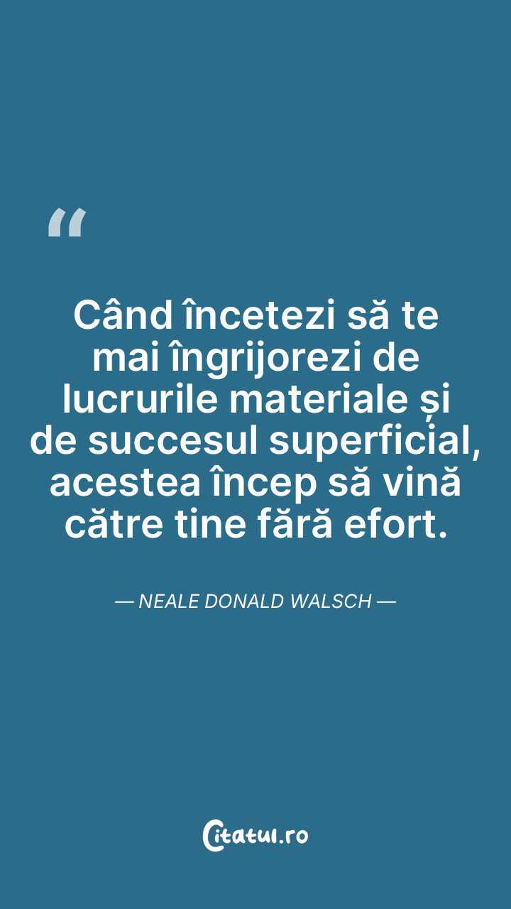 Când încetezi să te mai îngrijorezi de lucrurile materiale și de succesul superficial, acestea încep să vină către tine fără efort. Neale Donald Walsch