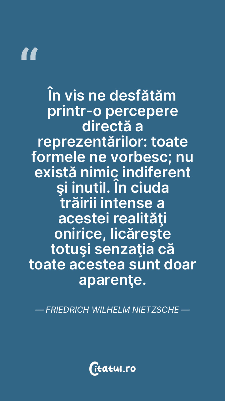 În vis ne desfătăm printr-o percepere directă a reprezentărilor: toate formele ne vorbesc; nu există nimic indiferent şi inutil. În ciuda trăirii intense a acestei realităţi onirice, licăreşte totuşi senzaţia că toate acestea sunt doar aparenţe. Friedrich Wilhelm Nietzsche