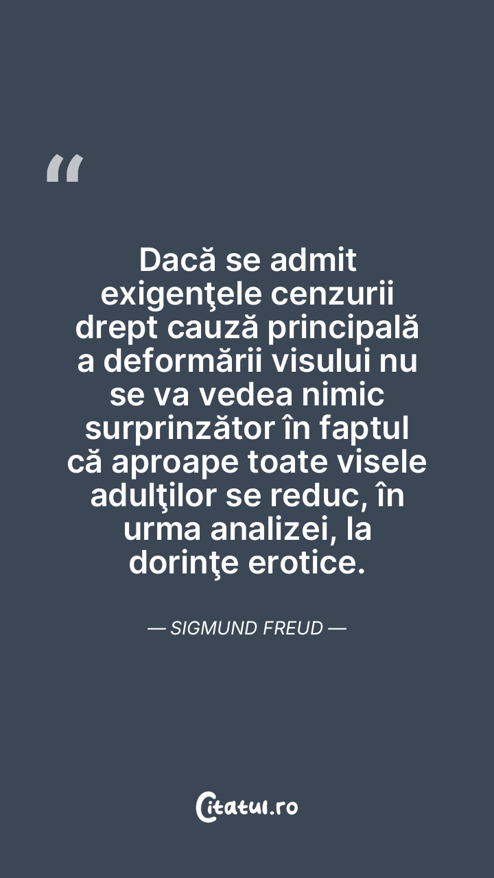 Dacă se admit exigenţele cenzurii drept cauză principală a deformării visului nu se va vedea nimic surprinzător în faptul că aproape toate visele adulţilor se reduc, în urma analizei, la dorinţe erotice. Sigmund Freud