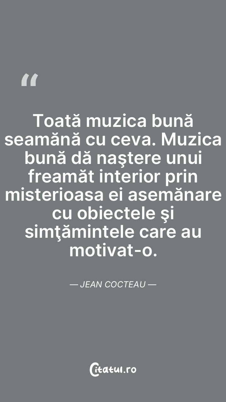 Toată muzica bună seamănă cu ceva. Muzica bună dă naştere unui freamăt interior prin misterioasa ei asemănare cu obiectele şi simţămintele care au motivat-o. Jean Cocteau