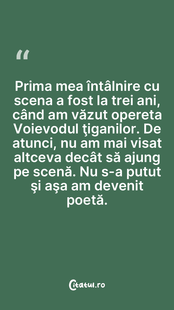 Prima mea întâlnire cu scena a fost la trei ani, când am văzut opereta Voievodul ţiganilor. De atunci, nu am mai visat altceva decât să ajung pe scenă. Nu s-a putut şi aşa am devenit poetă.
