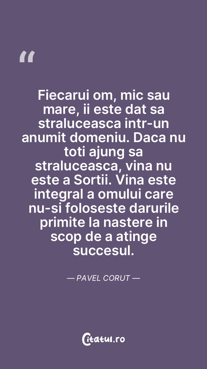 Fiecarui om, mic sau mare, ii este dat sa straluceasca intr-un anumit domeniu. Daca nu toti ajung sa straluceasca, vina nu este a Sortii. Vina este integral a omului care nu-si foloseste darurile primite la nastere in scop de a atinge succesul. Pavel Corut