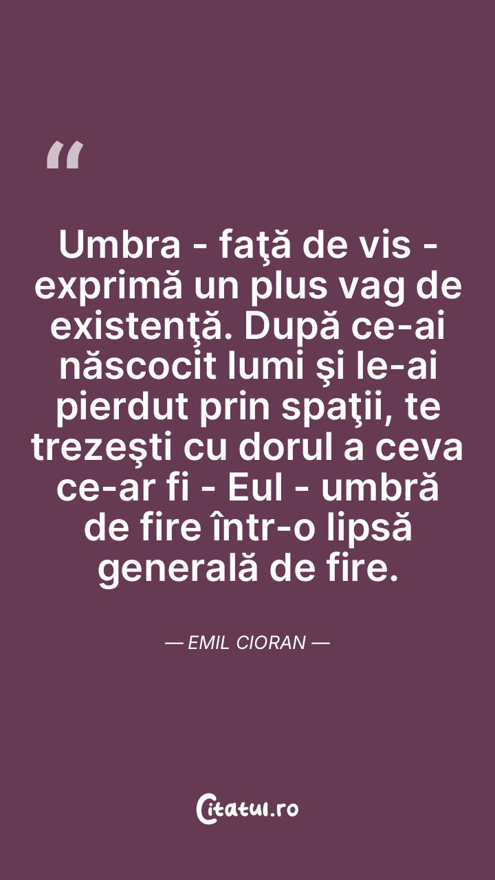 Umbra - faţă de vis - exprimă un plus vag de existenţă. După ce-ai născocit lumi şi le-ai pierdut prin spaţii, te trezeşti cu dorul a ceva ce-ar fi - Eul - umbră de fire într-o lipsă generală de fire. Emil Cioran