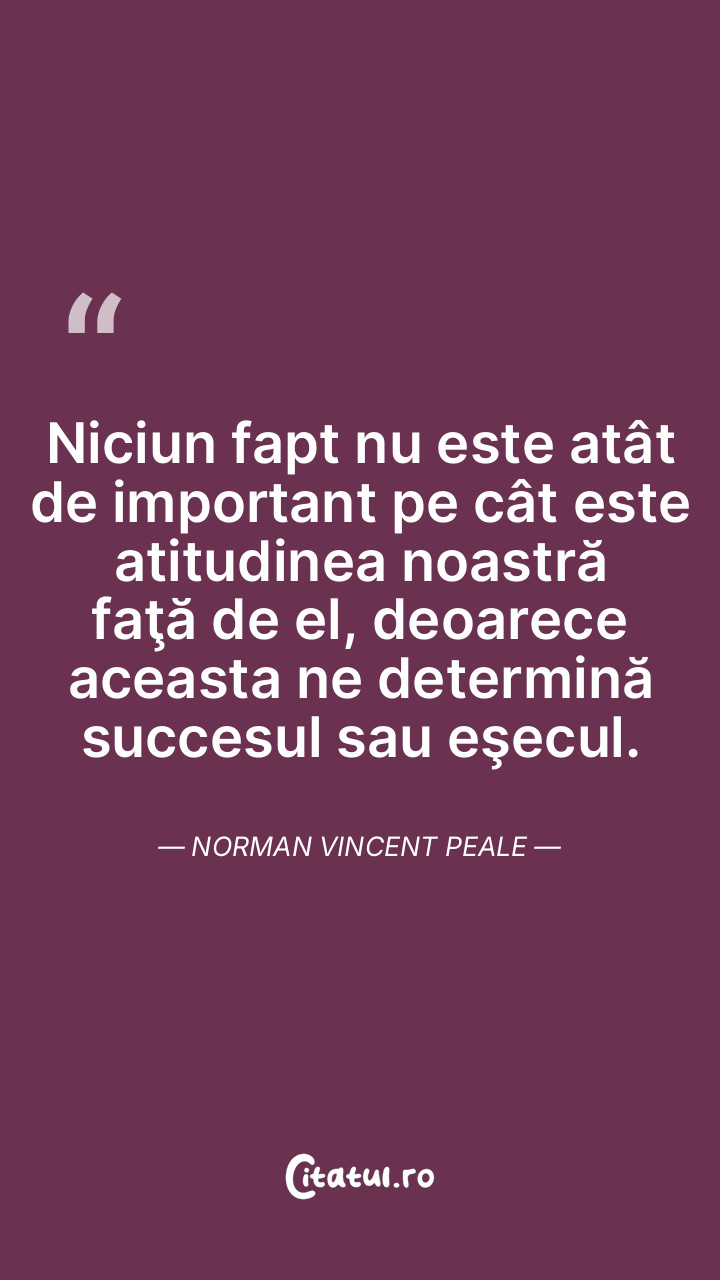 Niciun fapt nu este atât de important pe cât este atitudinea noastră faţă de el, deoarece aceasta ne determină succesul sau eşecul. Norman Vincent Peale