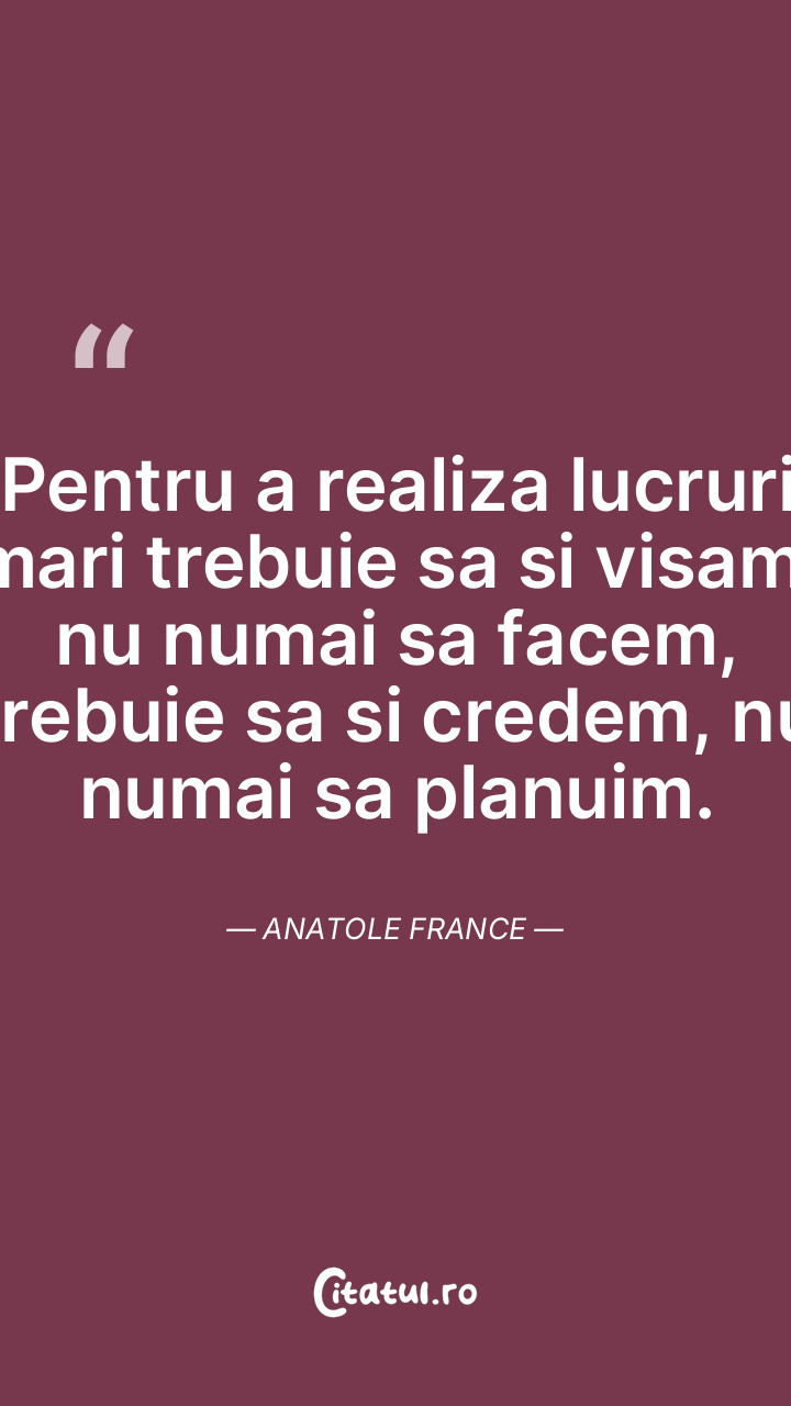 Pentru a realiza lucruri mari trebuie sa si visam, nu numai sa facem, trebuie sa si credem, nu numai sa planuim. Anatole France