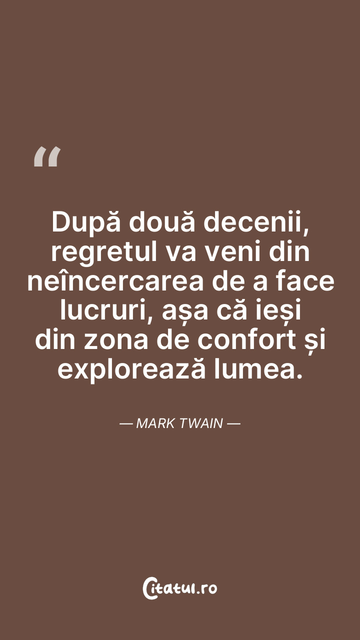 După două decenii, regretul va veni din neîncercarea de a face lucruri, așa că ieși din zona de confort și explorează lumea. Mark Twain