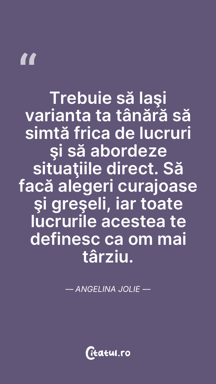 Trebuie să laşi varianta ta tânără să simtă frica de lucruri şi să abordeze situaţiile direct. Să facă alegeri curajoase şi greşeli, iar toate lucrurile acestea te definesc ca om mai târziu. Angelina Jolie