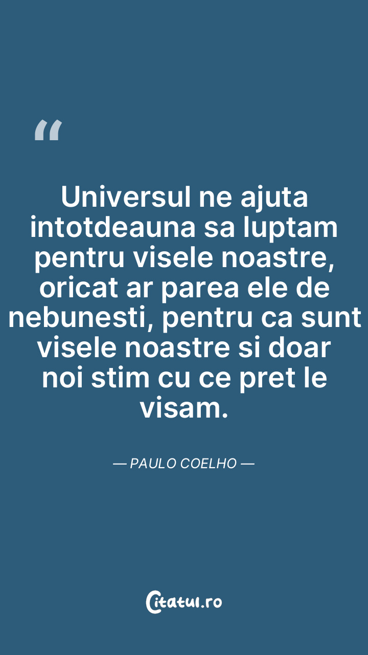 Universul ne ajuta intotdeauna sa luptam pentru visele noastre, oricat ar parea ele de nebunesti, pentru ca sunt visele noastre si doar noi stim cu ce pret le visam. Paulo Coelho