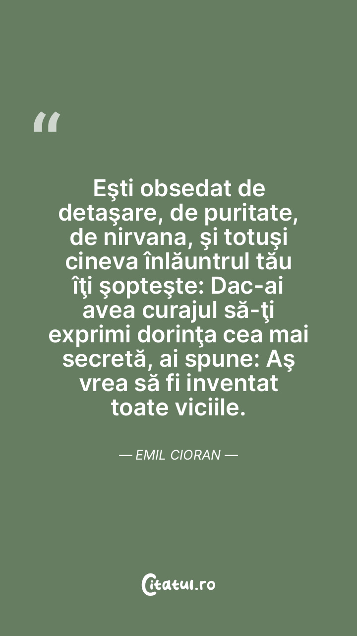 Eşti obsedat de detaşare, de puritate, de nirvana, şi totuşi cineva înlăuntrul tău îţi şopteşte: Dac-ai avea curajul să-ţi exprimi dorinţa cea mai secretă, ai spune: Aş vrea să fi inventat toate viciile. Emil Cioran