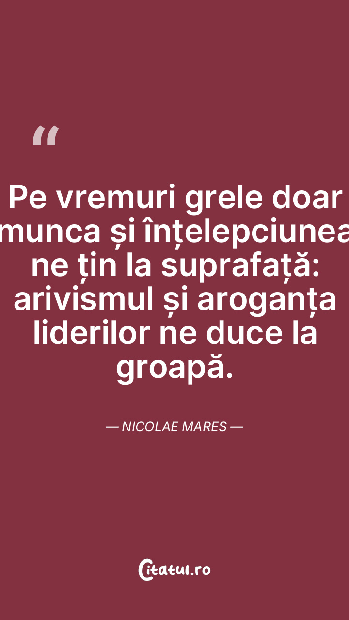 Pe vremuri grele doar munca și înțelepciunea ne țin la suprafață: arivismul și aroganța liderilor ne duce la groapă. Nicolae Mares