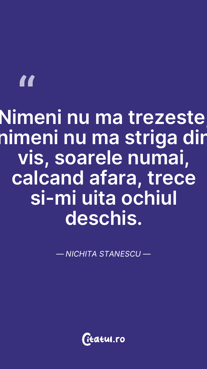 Nimeni nu ma trezeste, nimeni nu ma striga din vis, soarele numai, calcand afara, trece si-mi uita ochiul deschis. Nichita Stanescu