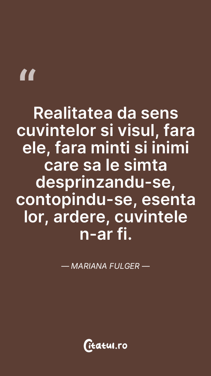 Realitatea da sens cuvintelor si visul, fara ele, fara minti si inimi care sa le simta desprinzandu-se, contopindu-se, esenta lor, ardere, cuvintele n-ar fi. Mariana Fulger