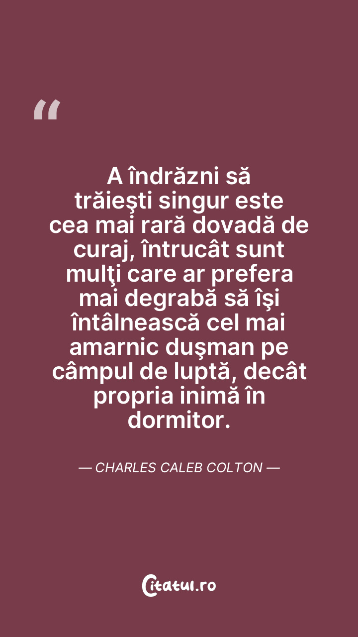 A îndrăzni să trăieşti singur este cea mai rară dovadă de curaj, întrucât sunt mulţi care ar prefera mai degrabă să îşi întâlnească cel mai amarnic duşman pe câmpul de luptă, decât propria inimă în dormitor. Charles Caleb Colton