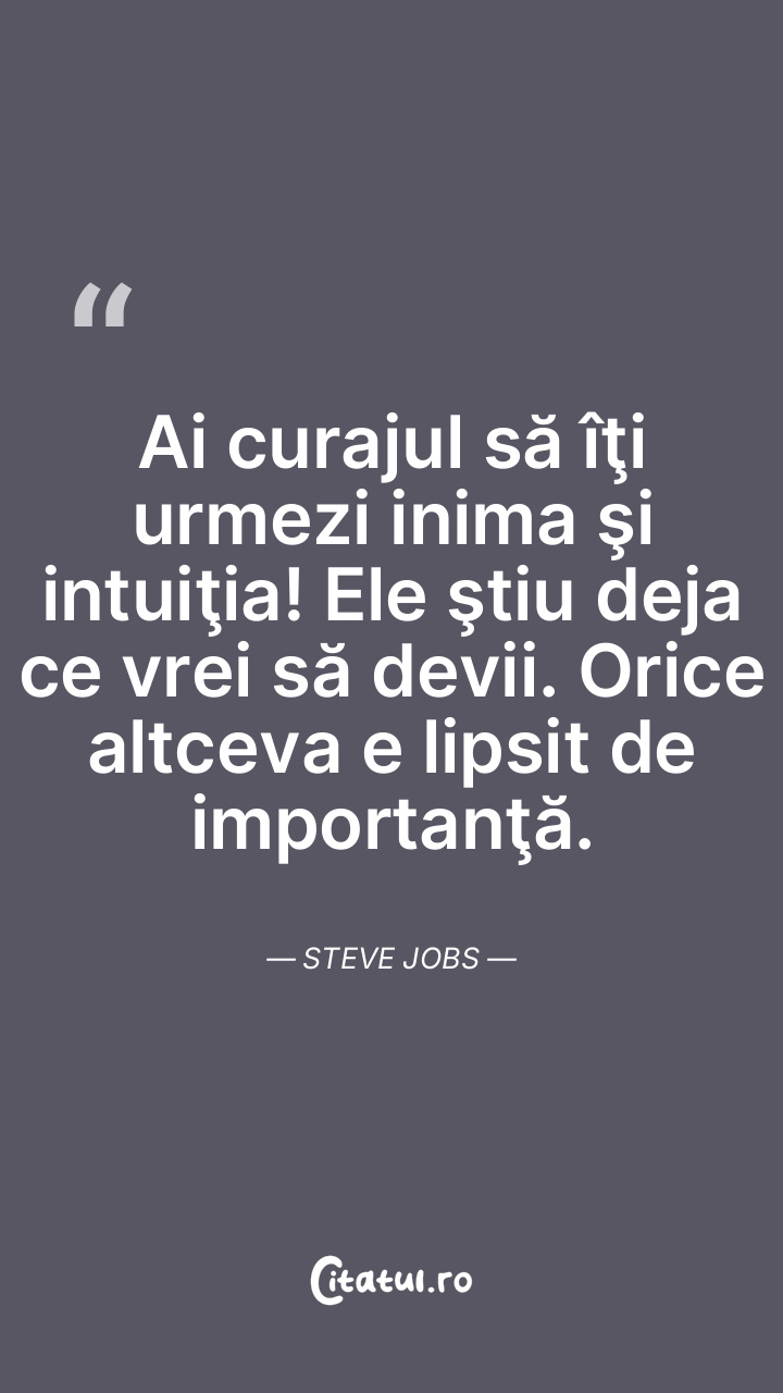 Ai curajul să îţi urmezi inima şi intuiţia! Ele ştiu deja ce vrei să devii. Orice altceva e lipsit de importanţă. Steve Jobs