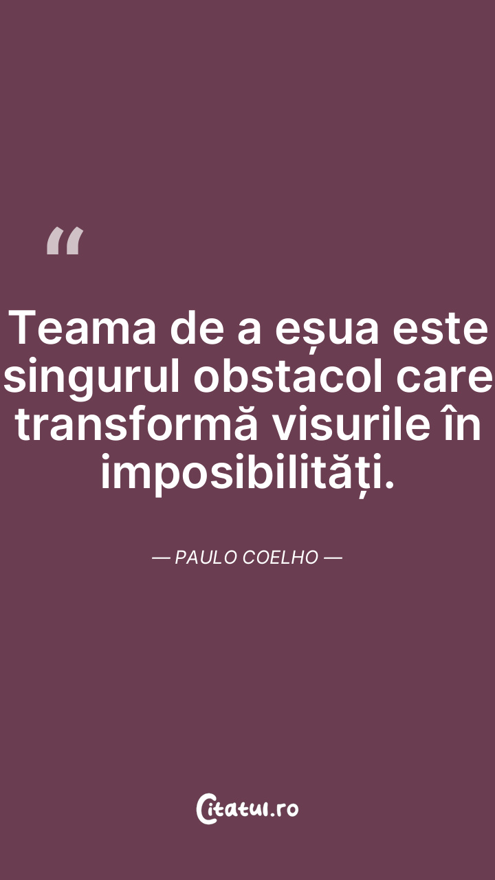 Teama de a eșua este singurul obstacol care transformă visurile în imposibilități. Paulo Coelho