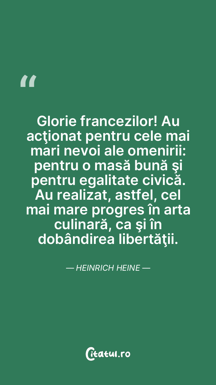 Glorie francezilor! Au acţionat pentru cele mai mari nevoi ale omenirii: pentru o masă bună şi pentru egalitate civică. Au realizat, astfel, cel mai mare progres în arta culinară, ca şi în dobândirea libertăţii. Heinrich Heine