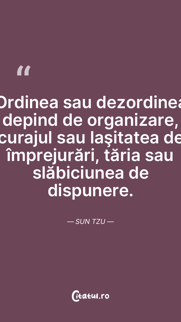 Ordinea sau dezordinea depind de organizare, curajul sau laşitatea de împrejurări, tăria sau slăbiciunea de dispunere. Sun Tzu