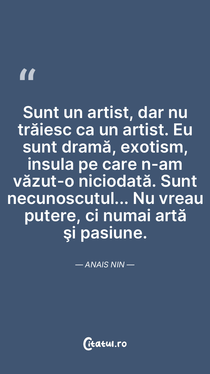 Sunt un artist, dar nu trăiesc ca un artist. Eu sunt dramă, exotism, insula pe care n-am văzut-o niciodată. Sunt necunoscutul... Nu vreau putere, ci numai artă şi pasiune. Anais Nin