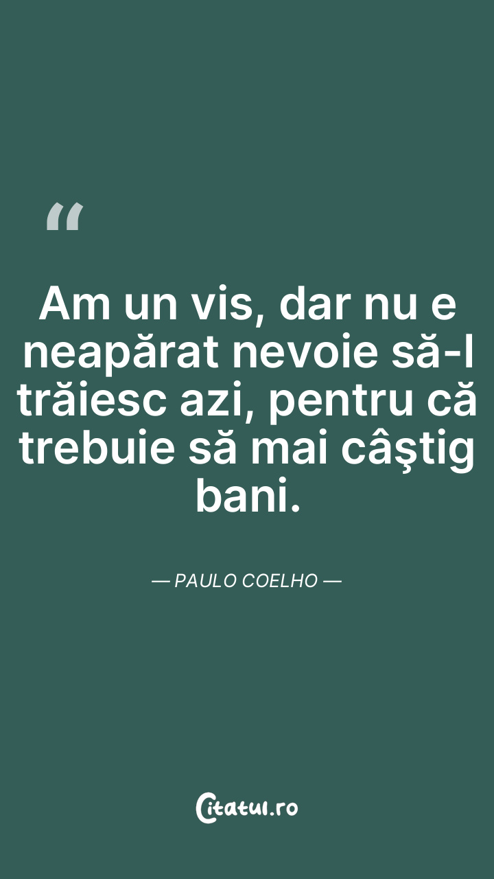 Am un vis, dar nu e neapărat nevoie să-l trăiesc azi, pentru că trebuie să mai câştig bani. Paulo Coelho