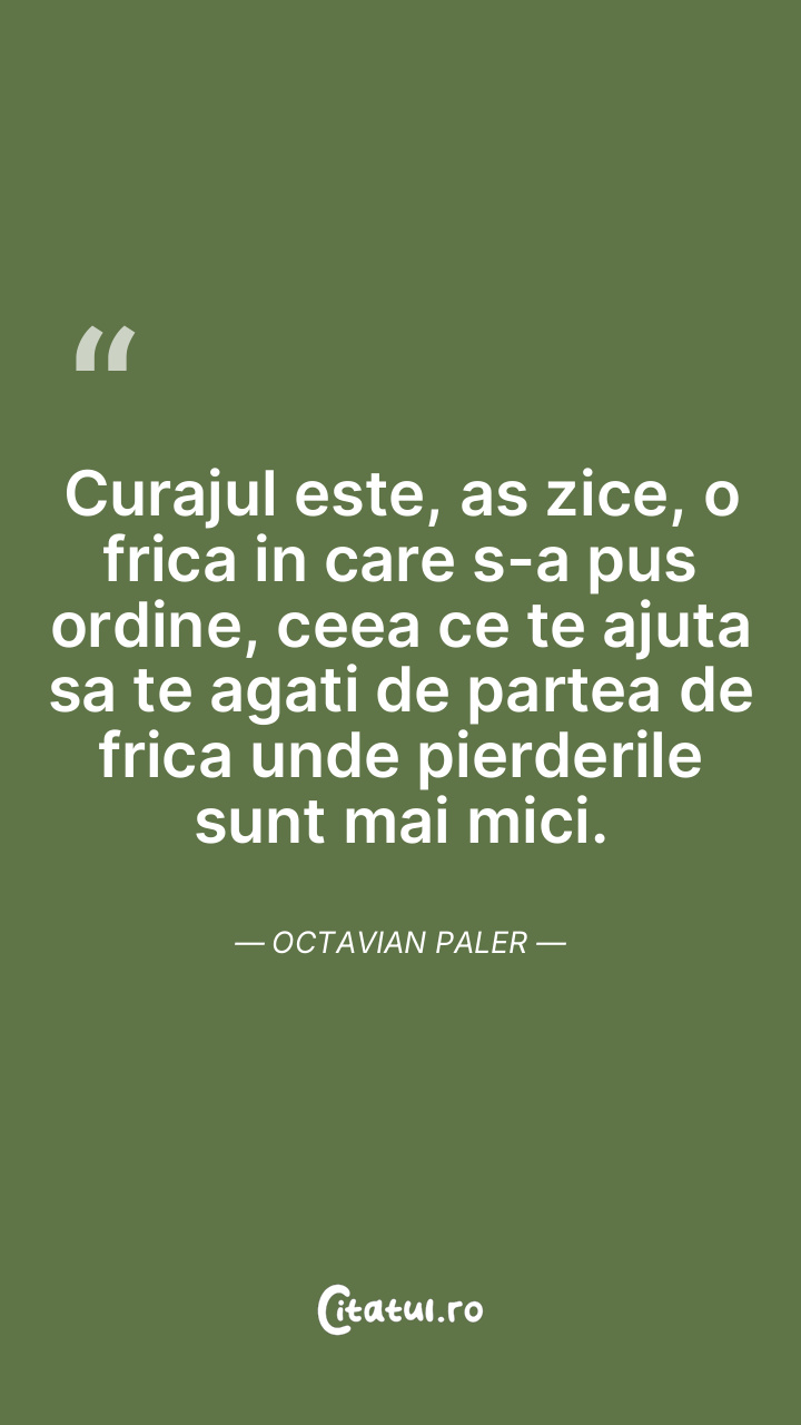 Curajul este, as zice, o frica in care s-a pus ordine, ceea ce te ajuta sa te agati de partea de frica unde pierderile sunt mai mici. Octavian Paler