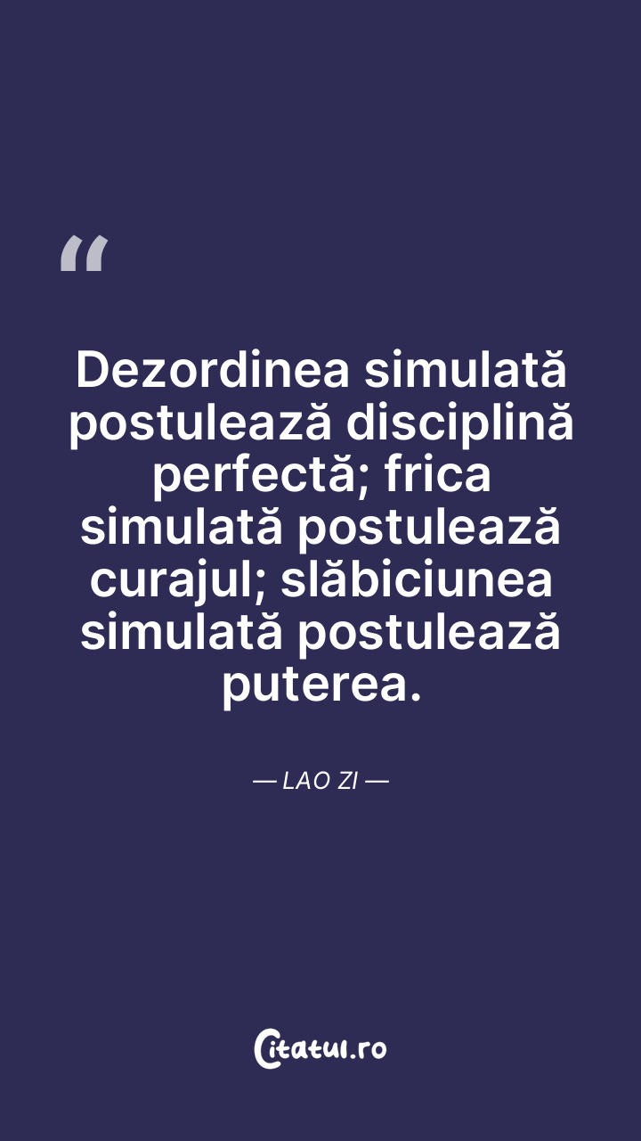 Dezordinea simulată postulează disciplină perfectă; frica simulată postulează curajul; slăbiciunea simulată postulează puterea. Lao Zi