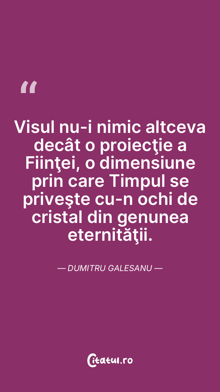 Visul nu-i nimic altceva decât o proiecţie a Fiinţei, o dimensiune prin care Timpul se priveşte cu-n ochi de cristal din genunea eternităţii. Dumitru Galesanu