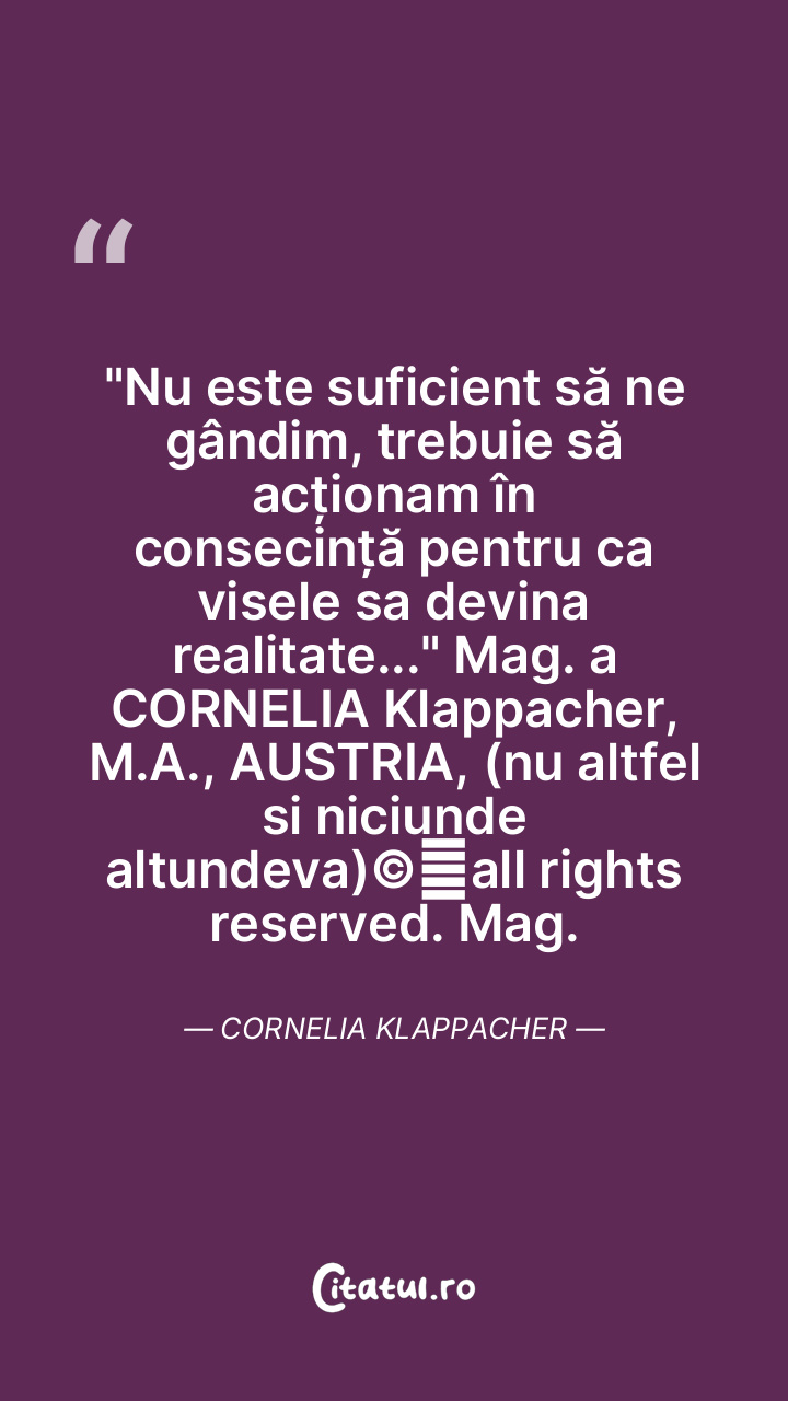 "Nu este suficient să ne gândim, trebuie să acționam în consecință pentru ca visele sa devina realitate..." Mag. a CORNELIA Klappacher, M.A., AUSTRIA, (nu altfel si niciunde altundeva)©️all rights reserved. Mag. Cornelia Klappacher