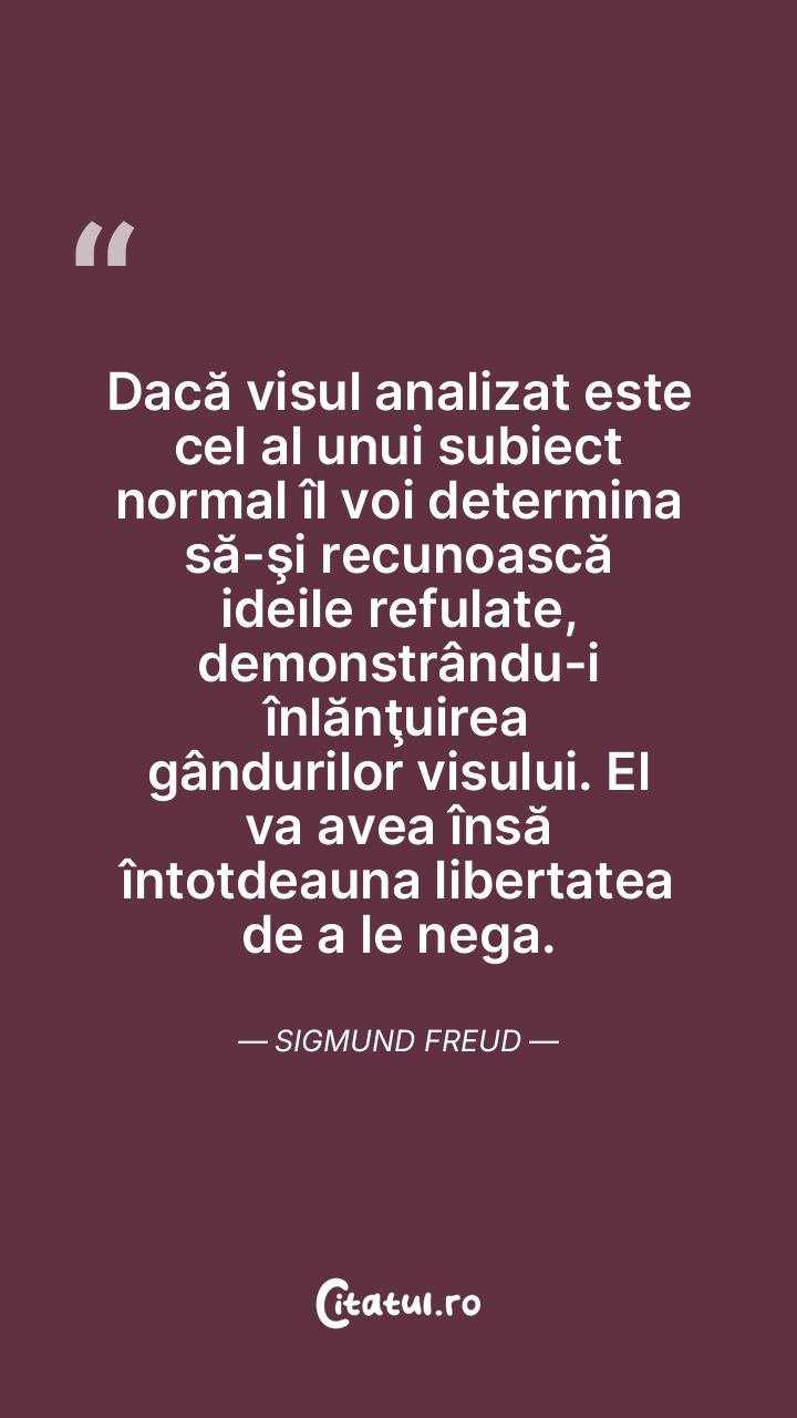 Dacă visul analizat este cel al unui subiect normal îl voi determina să-şi recunoască ideile refulate, demonstrându-i înlănţuirea gândurilor visului. El va avea însă întotdeauna libertatea de a le nega. Sigmund Freud