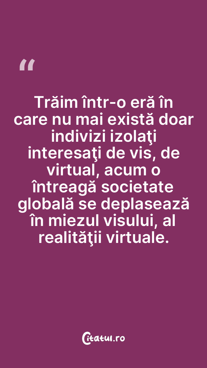 Trăim într-o eră în care nu mai există doar indivizi izolaţi interesaţi de vis, de virtual, acum o întreagă societate globală se deplasează în miezul visului, al realităţii virtuale.
