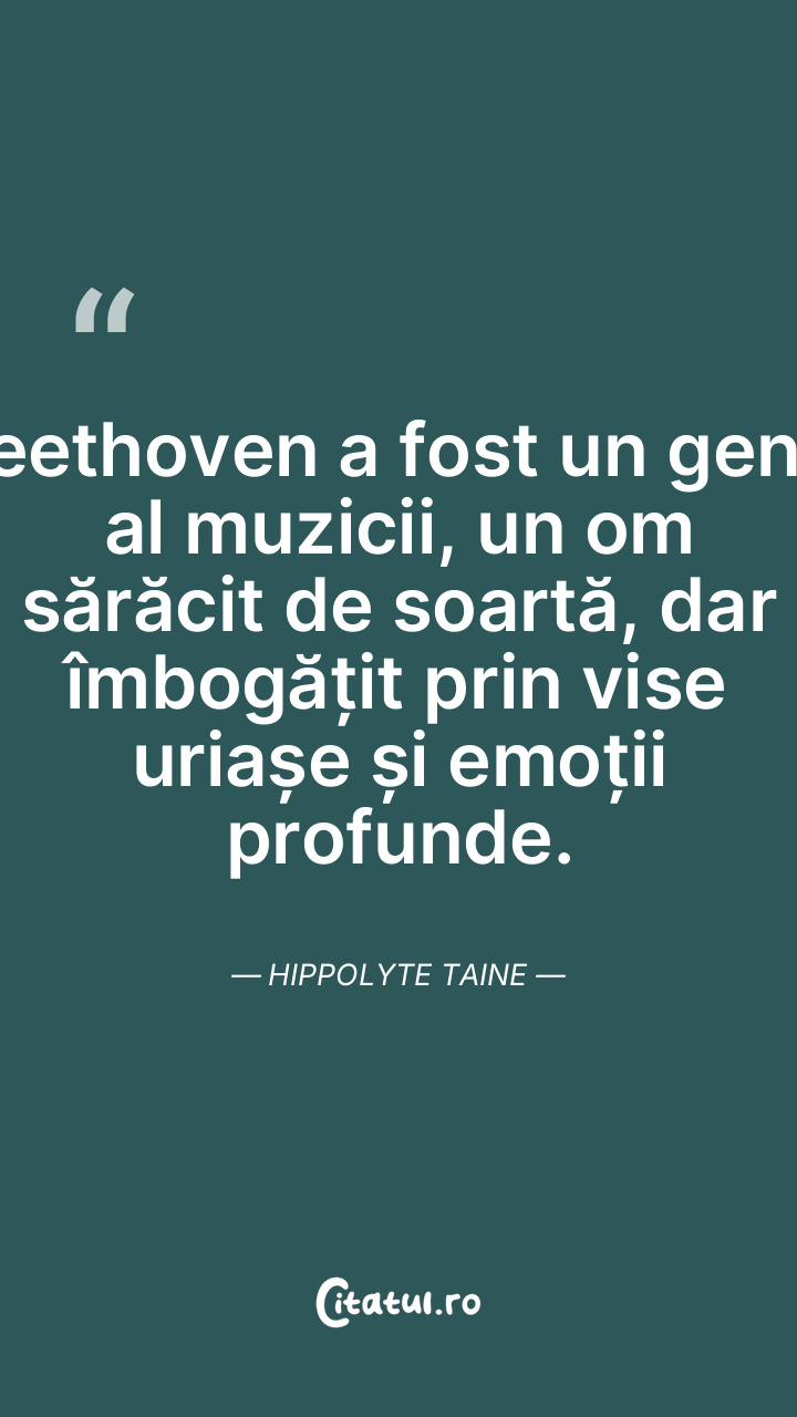 Beethoven a fost un geniu al muzicii, un om sărăcit de soartă, dar îmbogățit prin vise uriașe și emoții profunde. Hippolyte Taine
