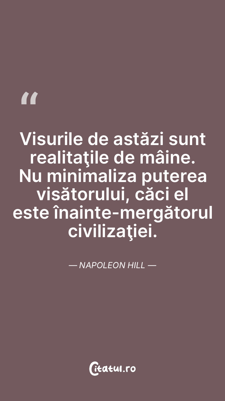 Visurile de astăzi sunt realitaţile de mâine. Nu minimaliza puterea visătorului, căci el este înainte-mergătorul civilizaţiei. Napoleon Hill