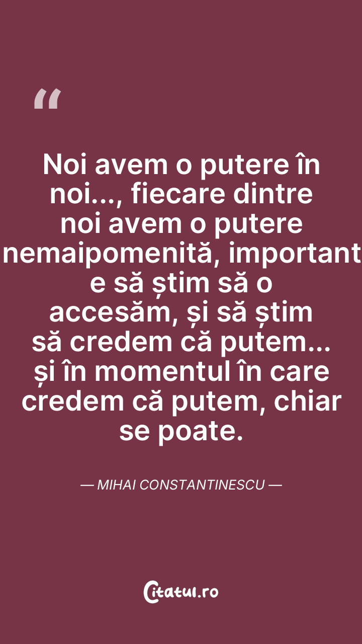 Noi avem o putere în noi..., fiecare dintre noi avem o putere nemaipomenită, important e să știm să o accesăm, și să știm să credem că putem... și în momentul în care credem că putem, chiar se poate. Mihai Constantinescu