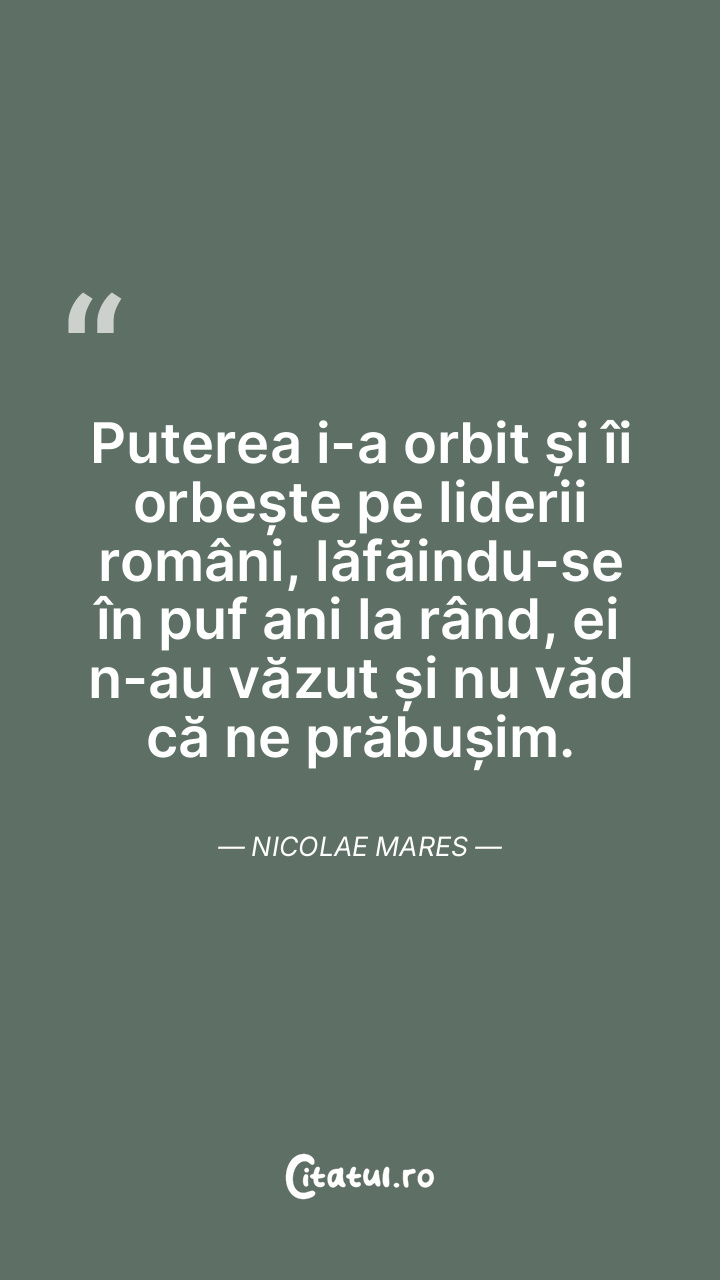 Puterea i-a orbit și îi orbește pe liderii români, lăfăindu-se în puf ani la rând, ei n-au văzut și nu văd că ne prăbușim. Nicolae Mares