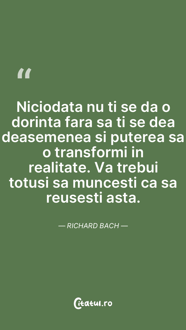 Niciodata nu ti se da o dorinta fara sa ti se dea deasemenea si puterea sa o transformi in realitate. Va trebui totusi sa muncesti ca sa reusesti asta. Richard Bach