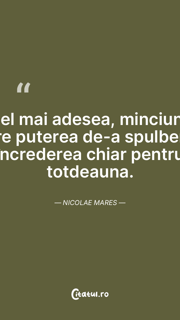 Cel mai adesea, minciuna are puterea de-a spulbera încrederea chiar pentru totdeauna. Nicolae Mares