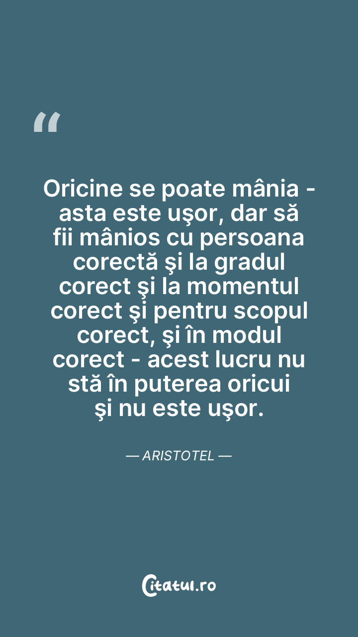 Oricine se poate mânia - asta este uşor, dar să fii mânios cu persoana corectă şi la gradul corect şi la momentul corect şi pentru scopul corect, şi în modul corect - acest lucru nu stă în puterea oricui şi nu este uşor. Aristotel
