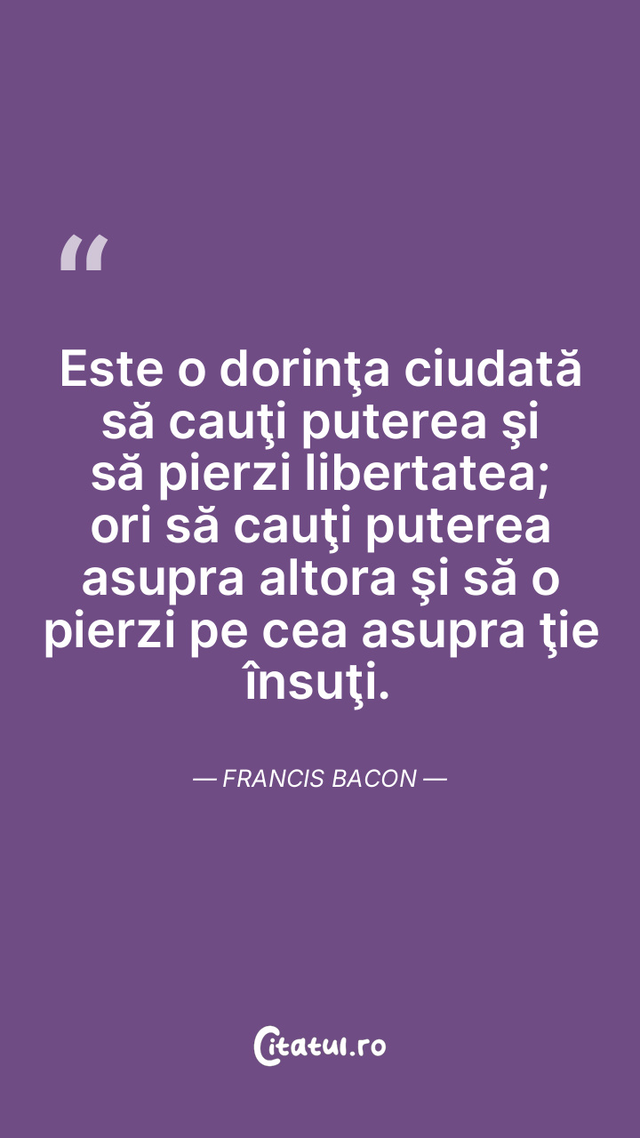Este o dorinţa ciudată să cauţi puterea şi să pierzi libertatea; ori să cauţi puterea asupra altora şi să o pierzi pe cea asupra ţie însuţi. Francis Bacon