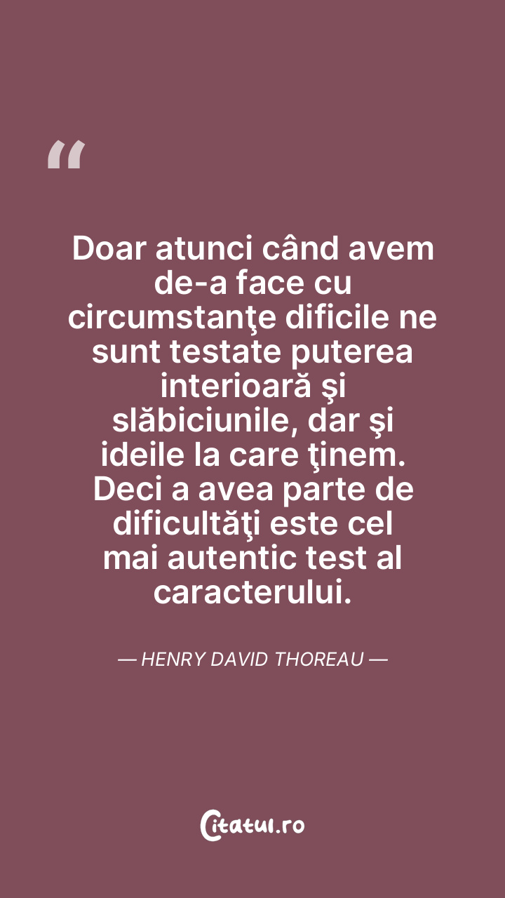 Doar atunci când avem de-a face cu circumstanţe dificile ne sunt testate puterea interioară şi slăbiciunile, dar şi ideile la care ţinem. Deci a avea parte de dificultăţi este cel mai autentic test al caracterului. Henry David Thoreau