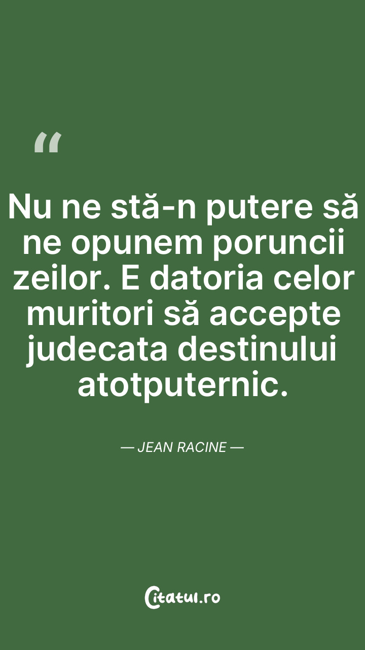 Nu ne stă-n putere să ne opunem poruncii zeilor. E datoria celor muritori să accepte judecata destinului atotputernic. Jean Racine