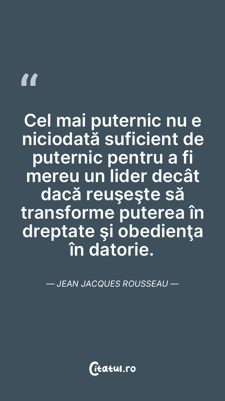 Cel mai puternic nu e niciodată suficient de puternic pentru a fi mereu un lider decât dacă reuşeşte să transforme puterea în dreptate şi obedienţa în datorie. Jean Jacques Rousseau