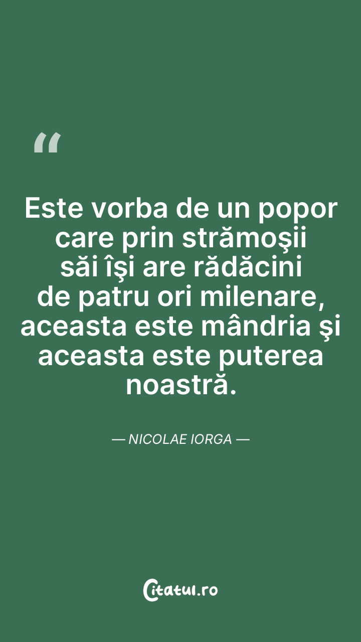 Este vorba de un popor care prin strămoşii săi îşi are rădăcini de patru ori milenare, aceasta este mândria şi aceasta este puterea noastră. Nicolae Iorga