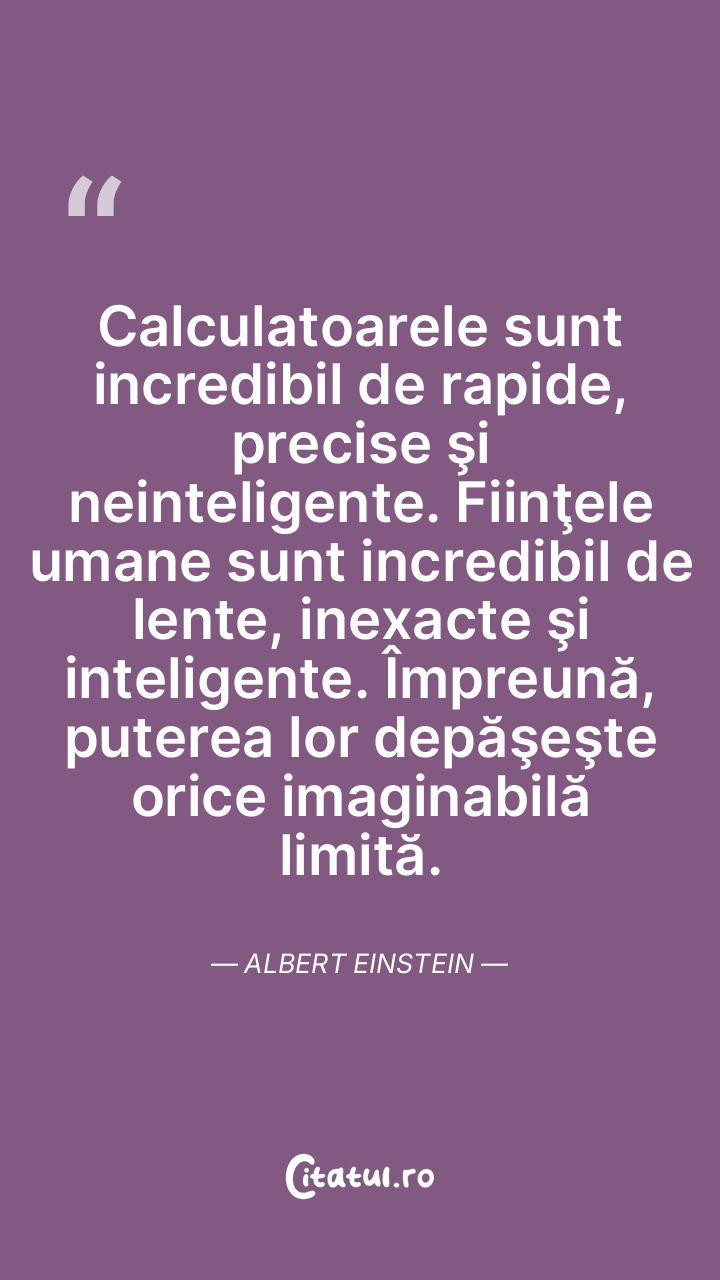 Calculatoarele sunt incredibil de rapide, precise şi neinteligente. Fiinţele umane sunt incredibil de lente, inexacte şi inteligente. Împreună, puterea lor depăşeşte orice imaginabilă limită. Albert Einstein