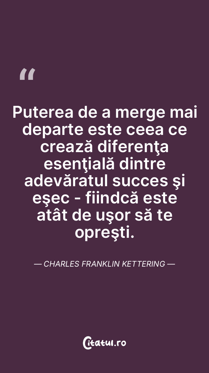 Puterea de a merge mai departe este ceea ce crează diferenţa esenţială dintre adevăratul succes şi eşec - fiindcă este atât de uşor să te opreşti. Charles Franklin Kettering