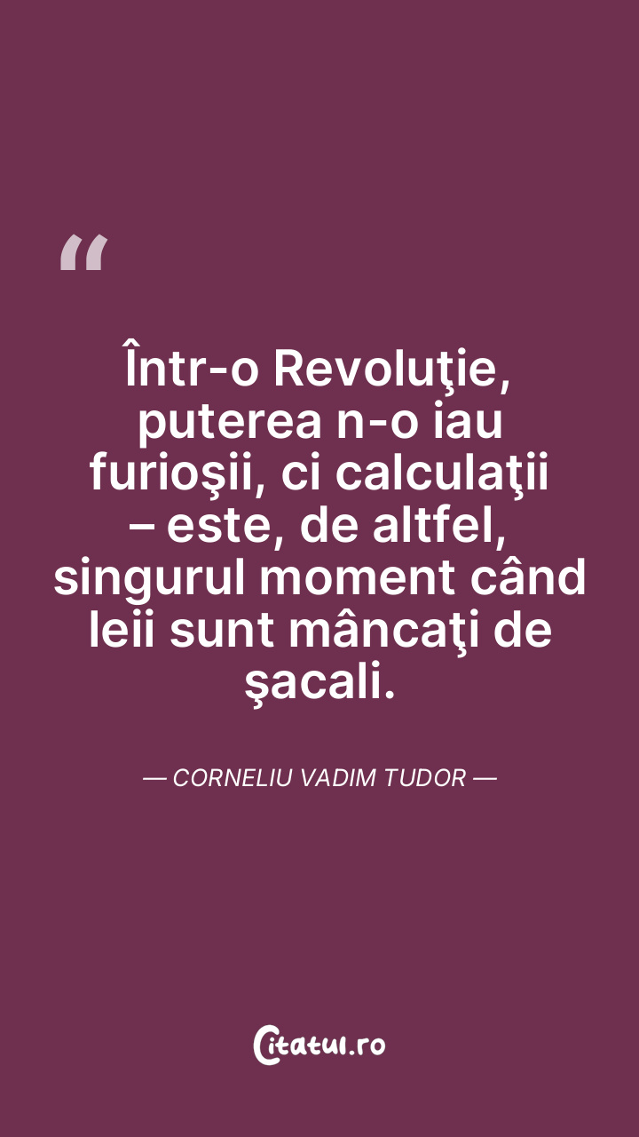 Într-o Revoluţie, puterea n-o iau furioşii, ci calculaţii – este, de altfel, singurul moment când leii sunt mâncaţi de şacali. Corneliu Vadim Tudor