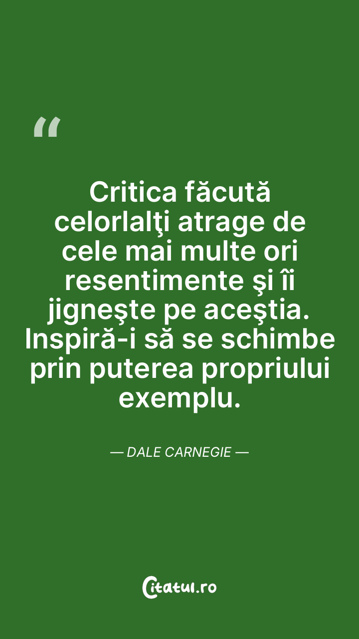 Critica făcută celorlalţi atrage de cele mai multe ori resentimente şi îi jigneşte pe aceştia. Inspiră-i să se schimbe prin puterea propriului exemplu. Dale Carnegie
