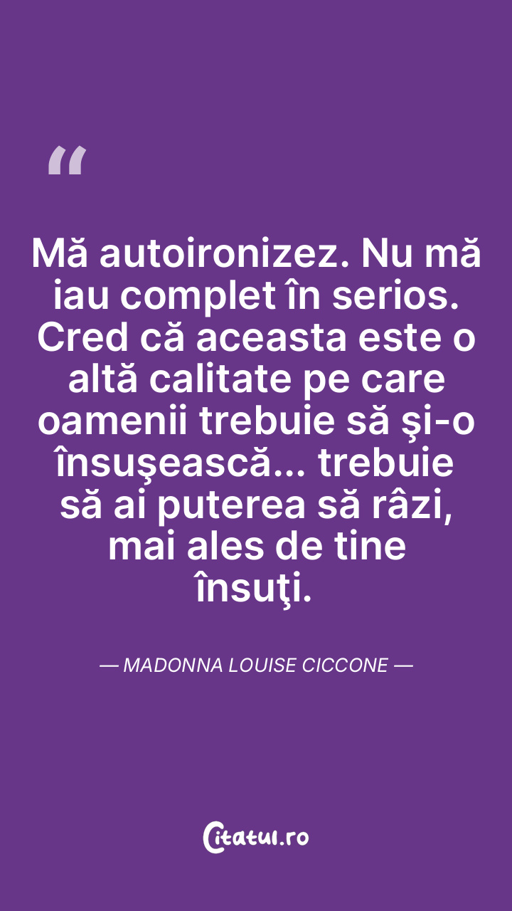 Mă autoironizez. Nu mă iau complet în serios. Cred că aceasta este o altă calitate pe care oamenii trebuie să şi-o însuşească... trebuie să ai puterea să râzi, mai ales de tine însuţi. Madonna Louise Ciccone