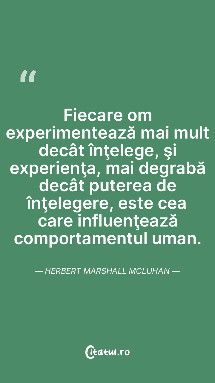 Fiecare om experimentează mai mult decât înţelege, şi experienţa, mai degrabă decât puterea de înţelegere, este cea care influenţează comportamentul uman. Herbert Marshall Mcluhan