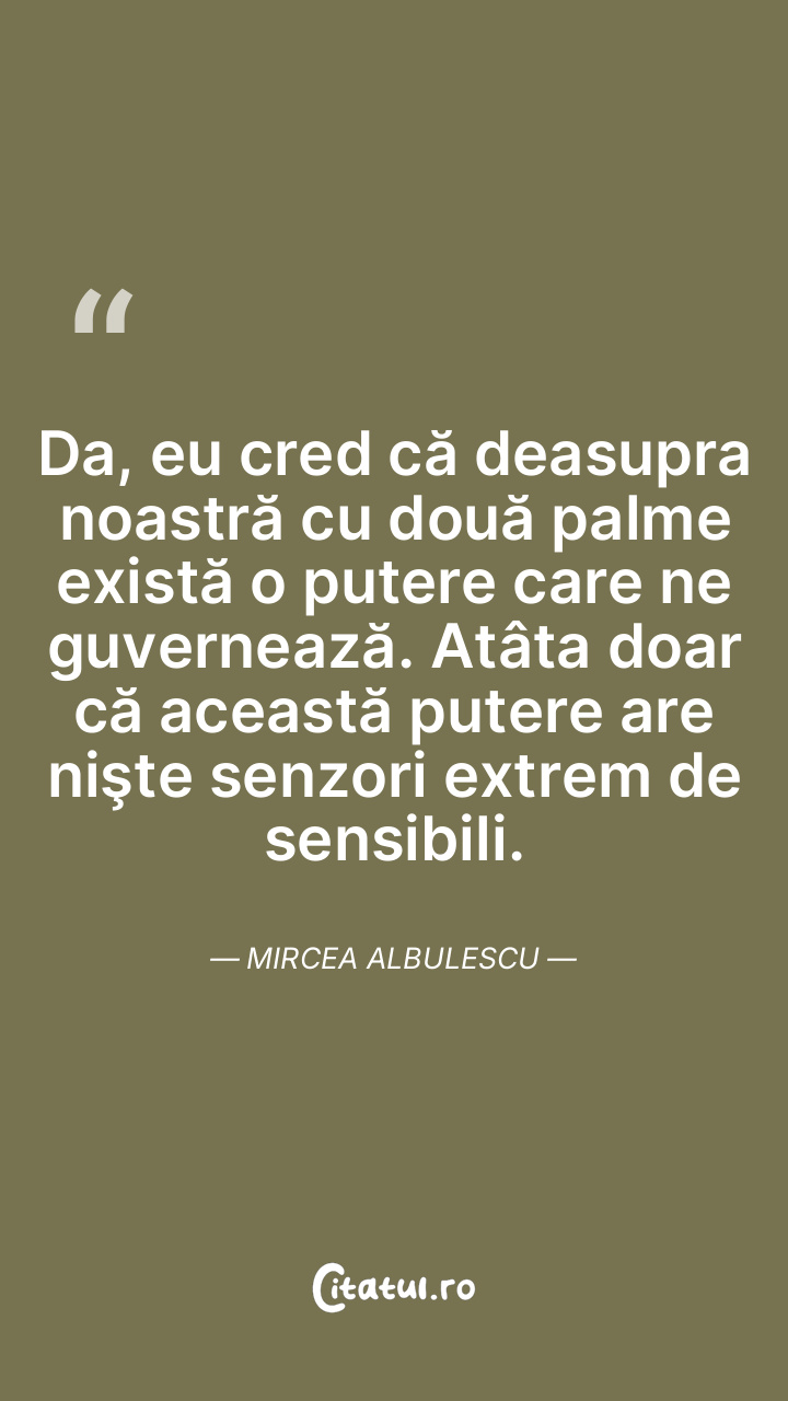 Da, eu cred că deasupra noastră cu două palme există o putere care ne guvernează. Atâta doar că această putere are nişte senzori extrem de sensibili. Mircea Albulescu
