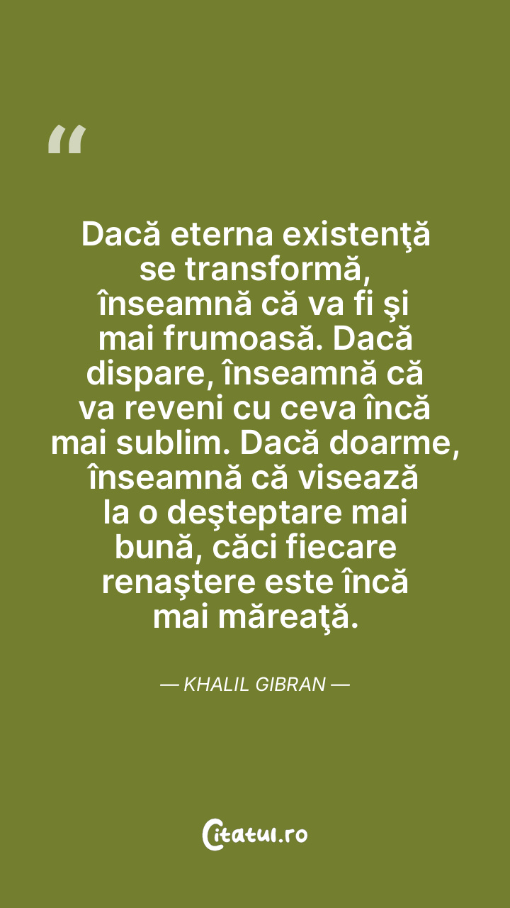 Dacă eterna existenţă se transformă, înseamnă că va fi şi mai frumoasă. Dacă dispare, înseamnă că va reveni cu ceva încă mai sublim. Dacă doarme, înseamnă că visează la o deşteptare mai bună, căci fiecare renaştere este încă mai măreaţă. Khalil Gibran