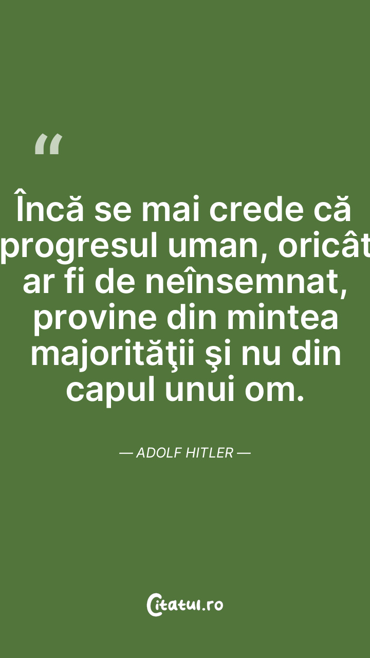 Încă se mai crede că progresul uman, oricât ar fi de neînsemnat, provine din mintea majorităţii şi nu din capul unui om. Adolf Hitler